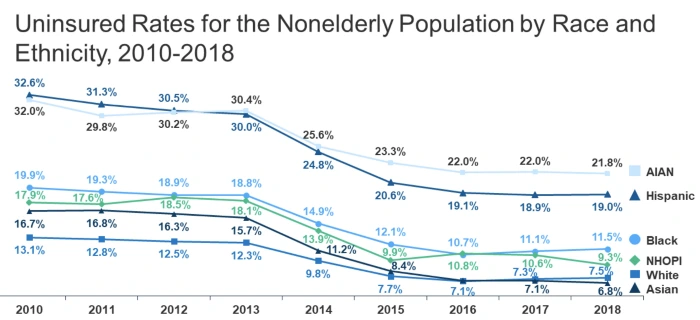 Even after the Affordable Care Act was passed, many Americans still don’t have health insurance, and even more are underinsured, meaning they have out of pocket costs that are unaffordable, so they still can’t get the care they need. Among the people who got insurance through their employer in 2018, 28% were still underinsured. In 2020, a look back at the last decade shows that primary care visits have decreased by nearly 25% in recent years, likely due to more plans charging co-insurance and higher co-pays for visits. This will lead to more problems later as opportunities for preventive health and screenings are missed, and people wait for conditions to progress to the point of needing to go to the ER or be hospitalized. Lack of health insurance coverage and access to care doesn’t affect everyone equally. There are large disparities based on race and income in the U.S.